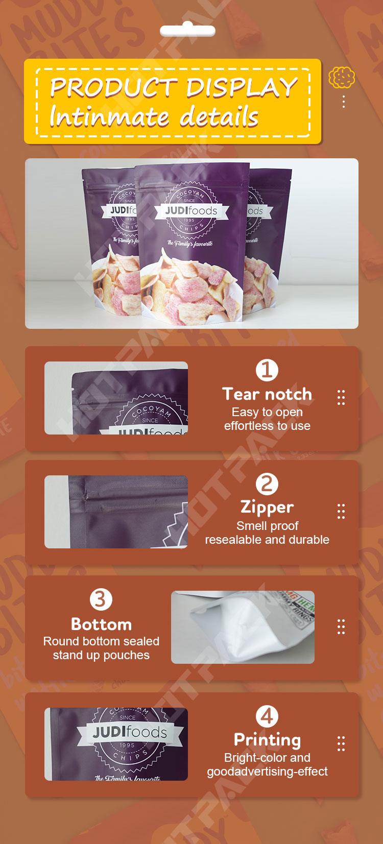 Zip lock, Top Slider, Tear Notch, Window, Hang Hole, Micro-Perforation, etc. |