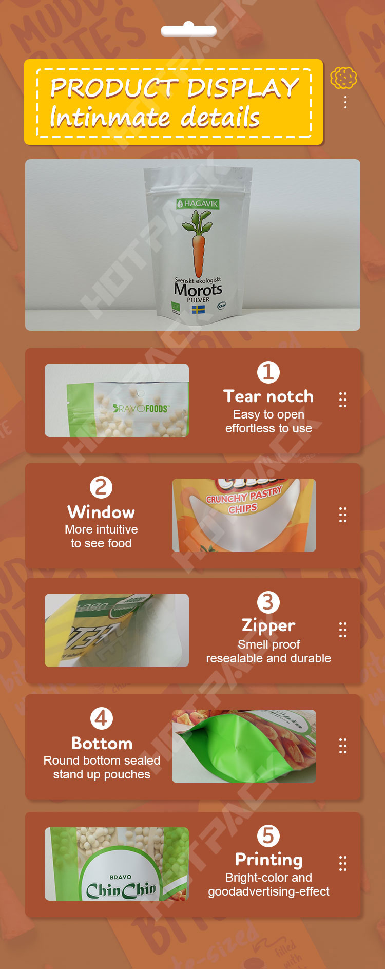 Zip lock, Top Slider, Tear Notch, Window, Hang Hole, Micro-Perforation, etc. |
