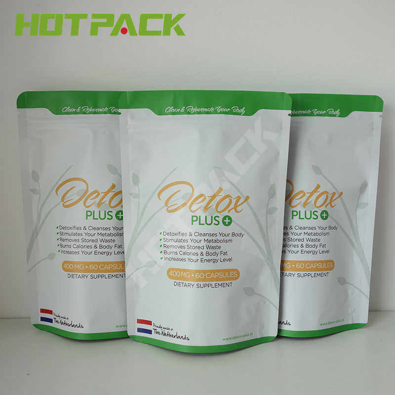 Custom logo matte zipper lock matte stand up food bags with hang hole for packaging capsule |